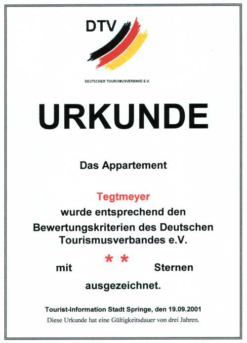 Unser Appartement wurde vom Deutschen Tourismusverband (DTV) mit zwei Sternen ausgezeichnet.